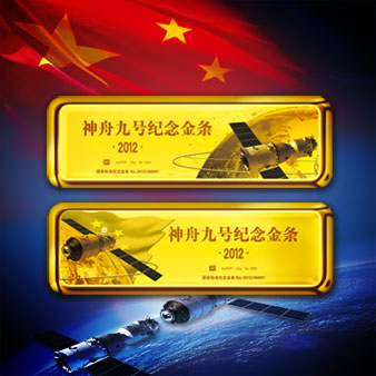 全套含2根25克Au9999金條,兩根金條正面分別精心雕鑄有神舟九號(hào)飛船與天宮一號(hào)環(huán)繞地球飛行的風(fēng)采。特別要說(shuō)明的是,兩根對(duì)接拼合在一起,寓意神舟九號(hào)與天宮一號(hào)成功對(duì)接,中國(guó)載人航天成功實(shí)現(xiàn)載人交會(huì)對(duì)接的新突破。兩根金條正面均鐫刻有“國(guó)家標(biāo)準(zhǔn)紀(jì)念金條”字樣和唯一編號(hào),背面均鐫刻有“中國(guó)載人航天工程辦公室監(jiān)制”字樣,全國(guó)僅限量發(fā)行2012套。