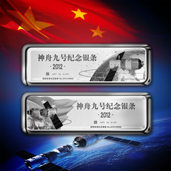 全套含2根50克Ag999銀條,兩根銀條正面分別精心雕鑄有神舟九號(hào)飛船與天宮一號(hào)環(huán)繞地球飛行的風(fēng)采。特別要說(shuō)明的是,兩根對(duì)接拼合在一起,寓意神舟九號(hào)與天宮一號(hào)成功對(duì)接,中國(guó)載人航天成功實(shí)現(xiàn)載人交會(huì)對(duì)接的新突破。兩根銀條正面均鐫刻有“國(guó)家標(biāo)準(zhǔn)紀(jì)念銀條”字樣和唯一編號(hào),背面均鐫刻有“中國(guó)載人航天工程辦公室監(jiān)制”字樣,全國(guó)僅限量發(fā)行2012套。