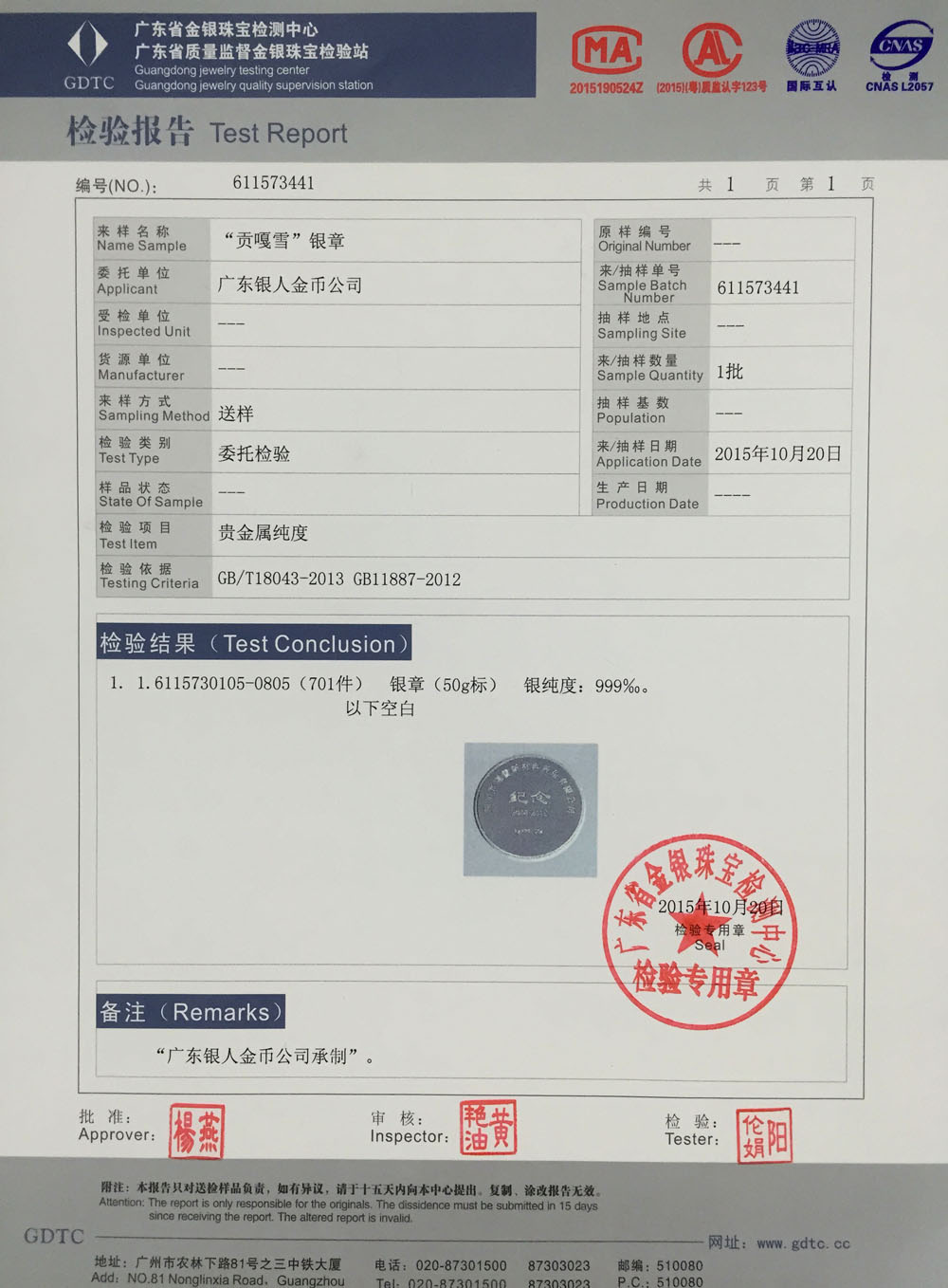 廣東省質(zhì)監(jiān)純金銀紀(jì)念章鑒定報(bào)告