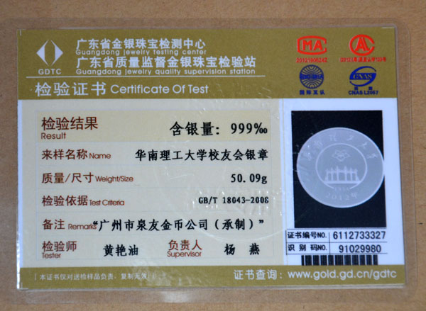 華南理工大學(xué)校友會(huì)紀(jì)念銀章檢測(cè)證書(shū)