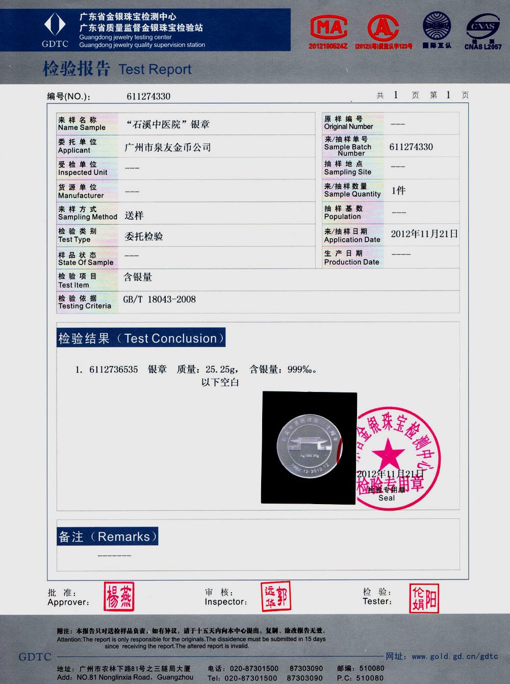 石溪中醫(yī)院成立30周年純銀紀(jì)念幣檢測(cè)報(bào)告