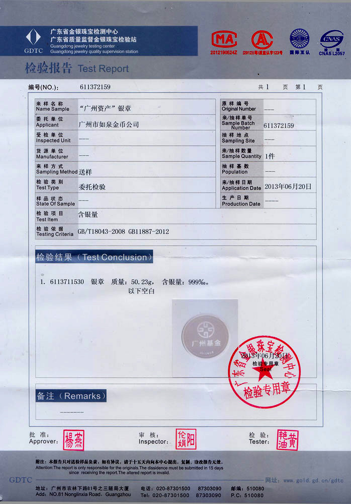 廣東省金銀珠寶檢測(cè)中心金銀幣鑒定證書(shū)