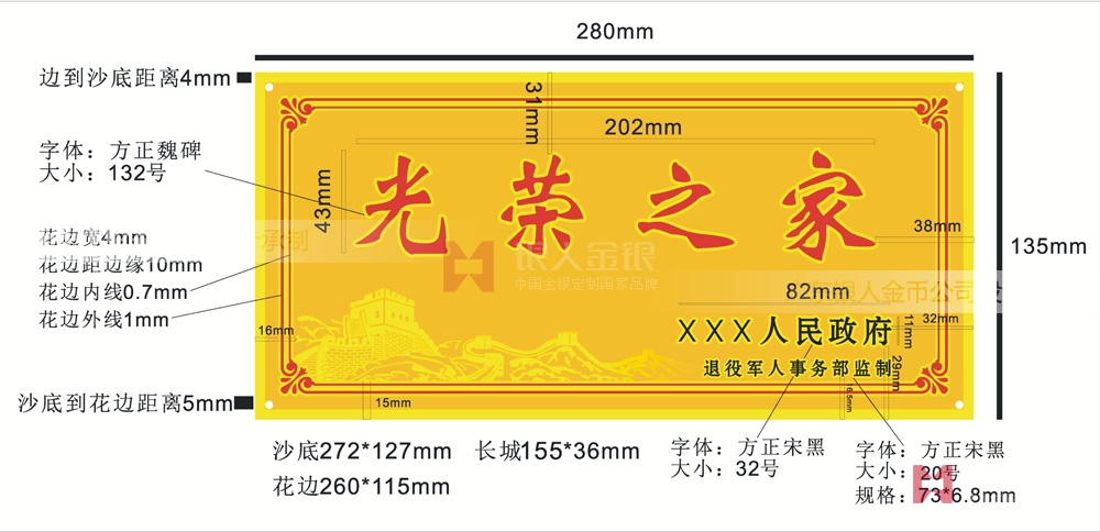 3、規(guī)格:牌面規(guī)格為280毫米×135毫米,厚度1毫米;“光榮之家”字樣為紅色套亮金邊,方正魏碑簡體132號(hào)字,四個(gè)字規(guī)格為202毫米×43毫米,距上邊31毫米,左右居中;“安徽省人民政府”字樣為方正宋體黑色32號(hào)簡體字,規(guī)格為82毫米×11毫米,距下邊29毫米,距右邊32毫米;左下角配長城圖案、亮金色,規(guī)格為155毫米×36毫米,距下邊15毫米,距左邊16毫米;紅色花邊寬4毫米,距邊緣10毫米,花邊內(nèi)線粗0.7毫米,花邊外線粗1毫米。右下花邊內(nèi)“退役軍人事務(wù)部監(jiān)制”字樣為方正宋體黑色20號(hào)字,規(guī)格為73毫米×6.8毫米,距下邊16.5毫米,與“安徽省人民政府”右端對(duì)齊;四角打孔,緊固孔直徑3.6毫米±0.2毫米,位置如圖一所示。