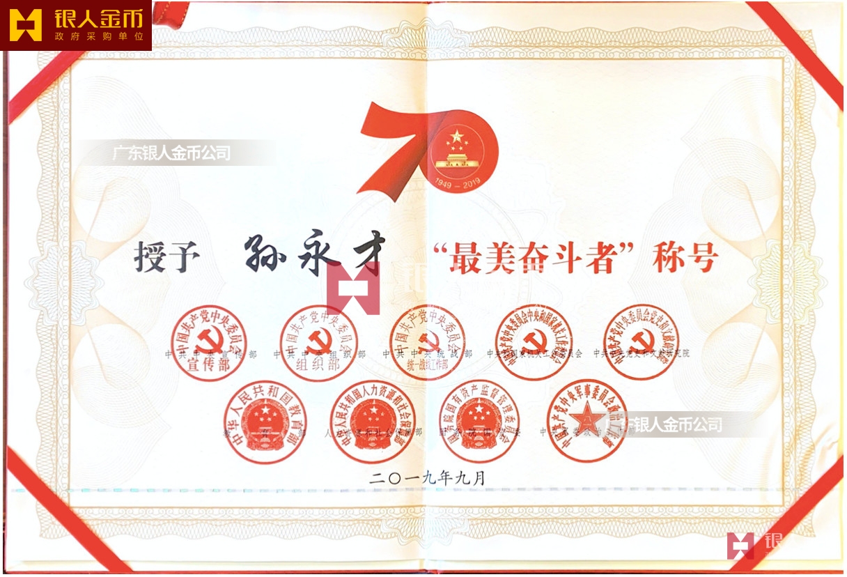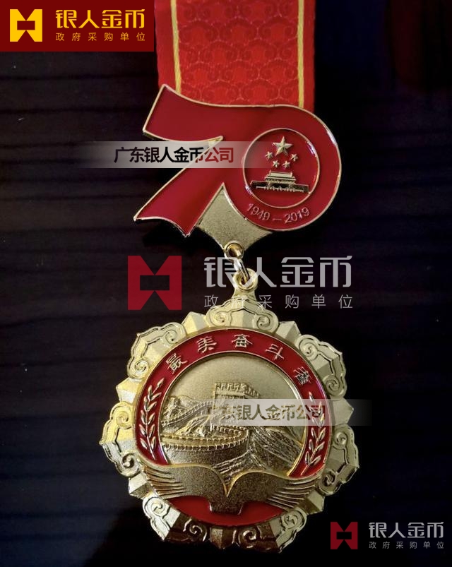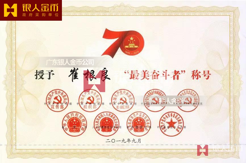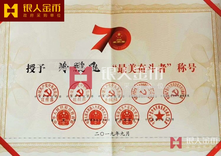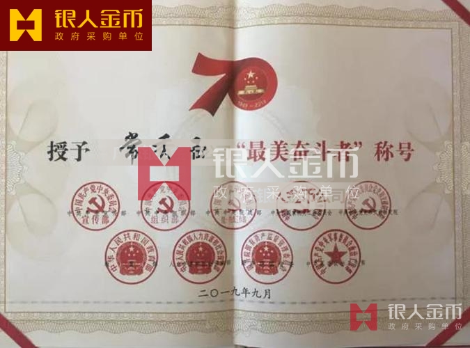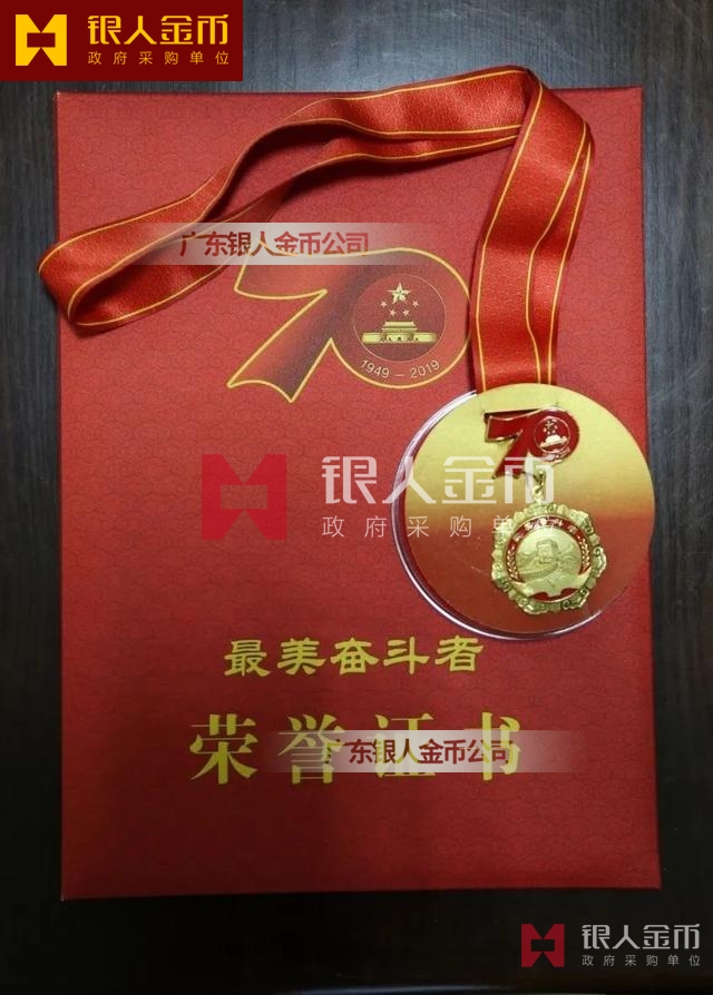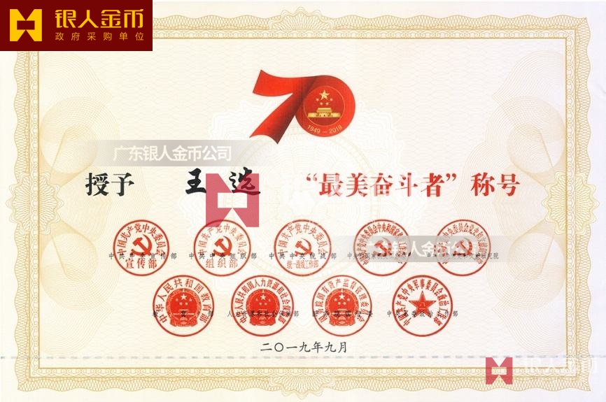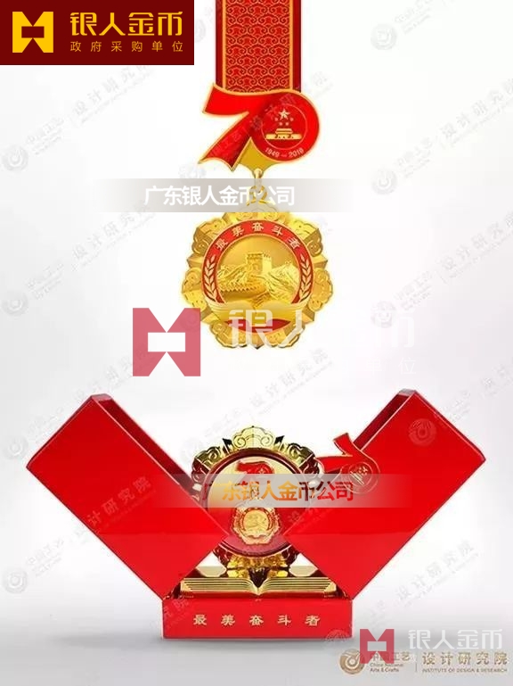 “最美奮斗者”榮譽獎?wù)虏捎勉y胎鍍金工藝完成,獎?wù)轮睆?9mm,寓意為1949年中華人民共和國成立,獎?wù)潞?mm,寓意慶祝中華人民共和國成立70周年。獎?wù)律喜糠譃橹腥A人民共和國成立70周年活動標識,下部分為“最美奮斗者”獎?wù)?,整體設(shè)計體現(xiàn)儀式感、莊嚴感和時代感,彰顯“禮贊新中國,奮進新時代”的精神內(nèi)涵。