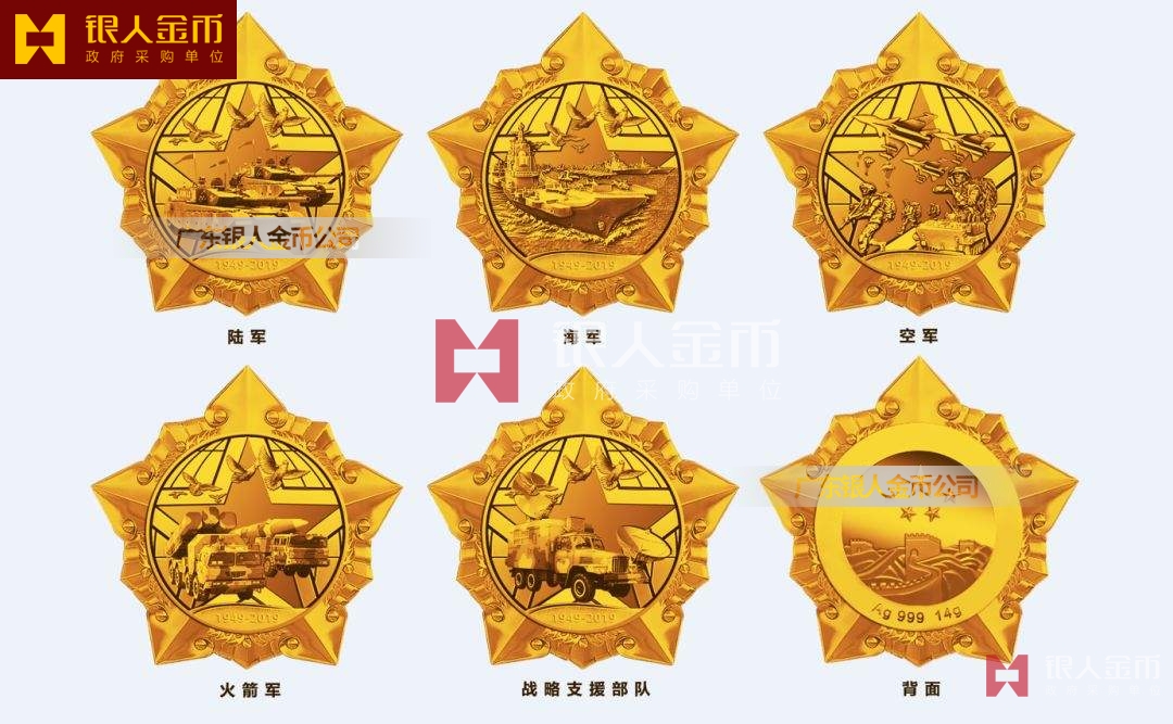 正面以陸軍、海軍、空軍、火箭軍、戰(zhàn)略軍五大軍種主圖案,呈現(xiàn)了五大軍種斗志昂揚(yáng)的精神風(fēng)貌,背面圖案為五星及長城,寓意共產(chǎn)黨領(lǐng)導(dǎo)下的人民軍隊(duì),是保衛(wèi)祖國的鋼鐵長城。
