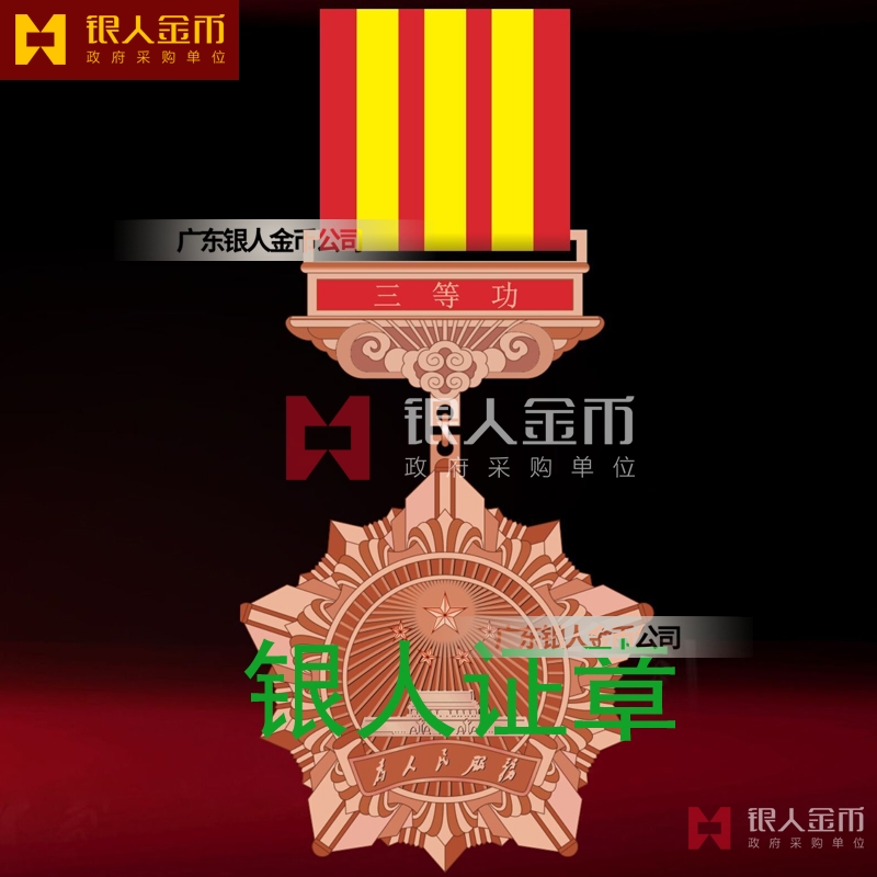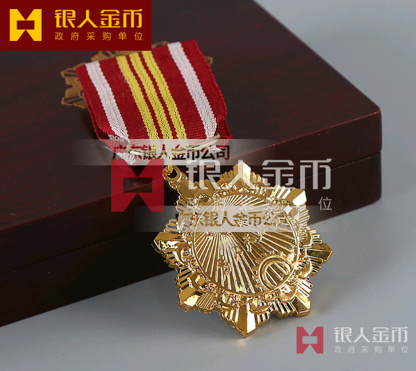 一、二、三等功獎(jiǎng)?wù)掠摄~壓制成型,分別采用鍍金、銀、銅工藝。核心區(qū)上部為五星圖案;中部為天安門圖案;下部為毛澤東同志書寫的“為人民服務(wù)”字樣,采用紅色填釉工藝;核