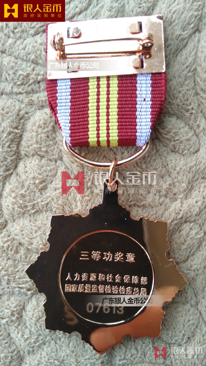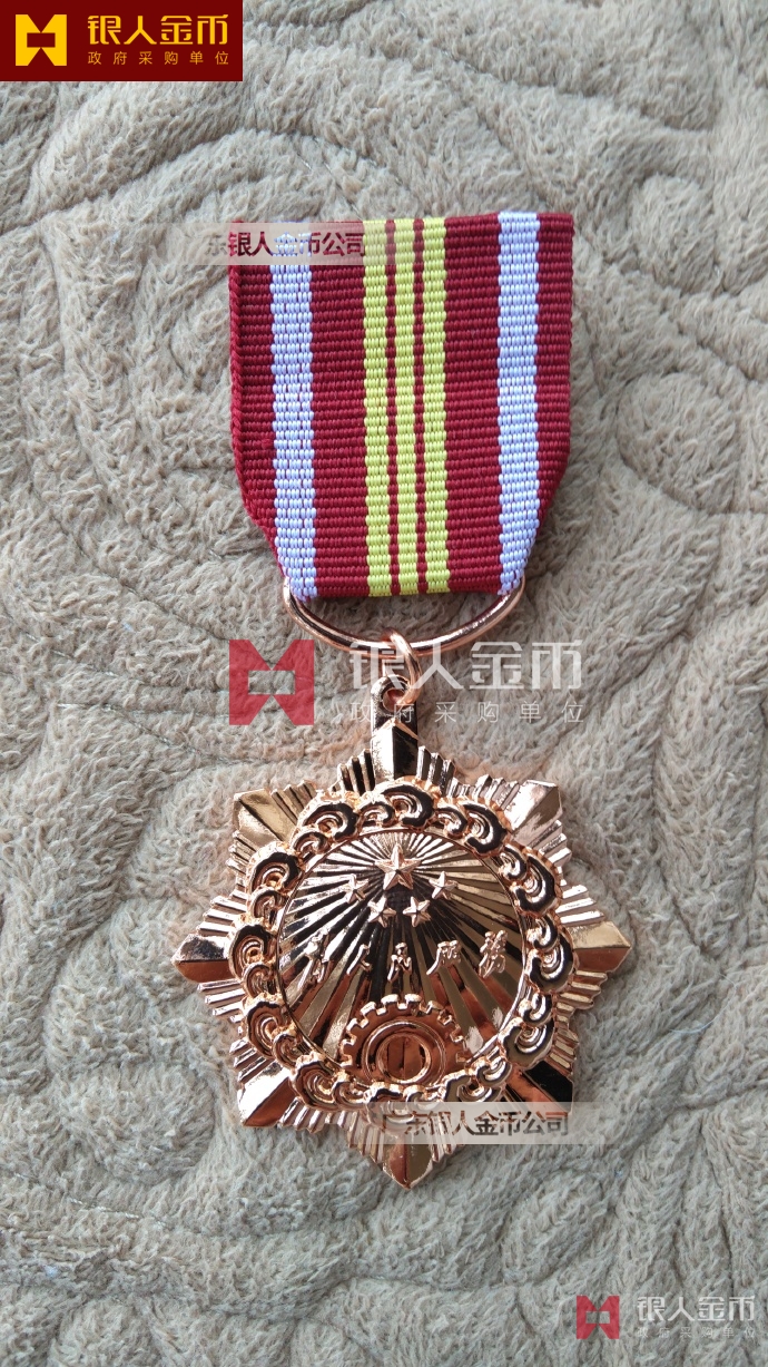 別為齒輪和綢帶圖案;外圈為五角光芒;上章鐫刻獎(jiǎng)項(xiàng)名稱,分別標(biāo)明一、二、三等功,采用紅色填釉工藝。獎(jiǎng)?wù)卤澈髽?biāo)明監(jiān)制機(jī)關(guān)名稱。綬帶為絲質(zhì),大紅色,分別用一條、二條