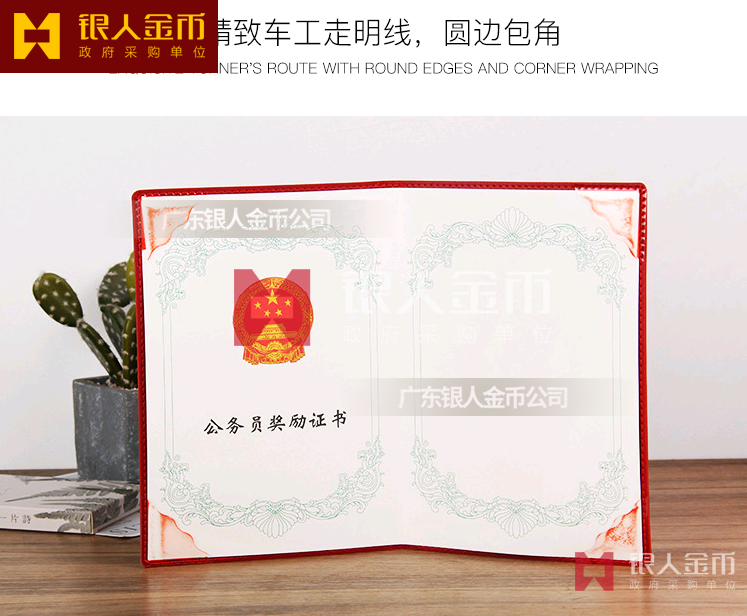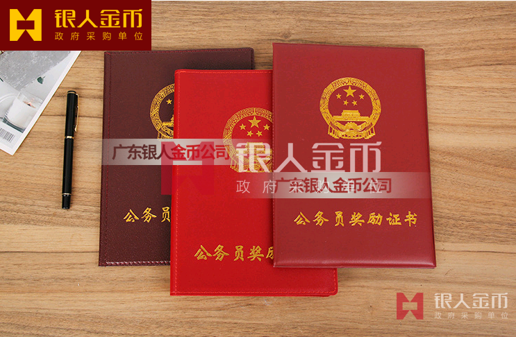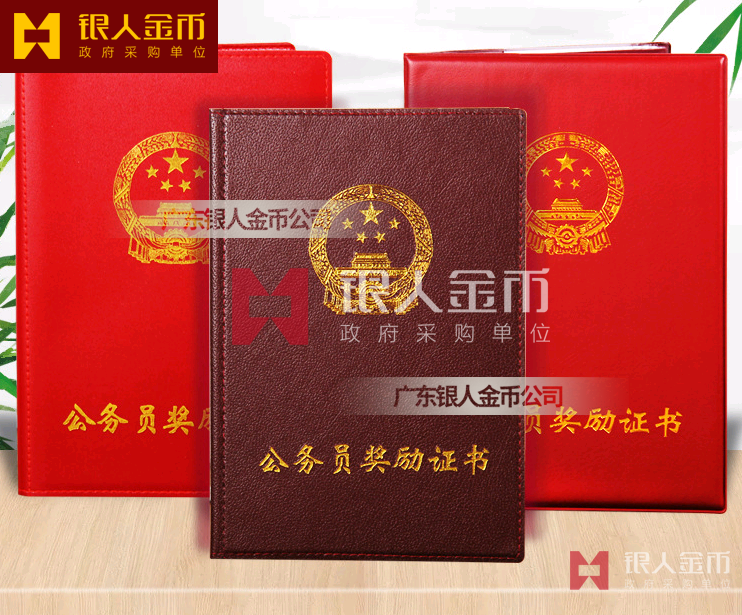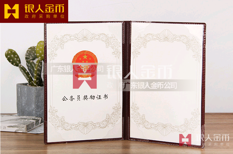 本證書適用于對(duì)公務(wù)員、公務(wù)員集體的獎(jiǎng)勵(lì)。證書規(guī)格為410×290毫米(展開)。封面選用國(guó)旗紅色絲綢材料,燙金印制國(guó)徽?qǐng)D案及“公務(wù)員獎(jiǎng)勵(lì)證書”字樣,字體為魏碑,54號(hào)字,