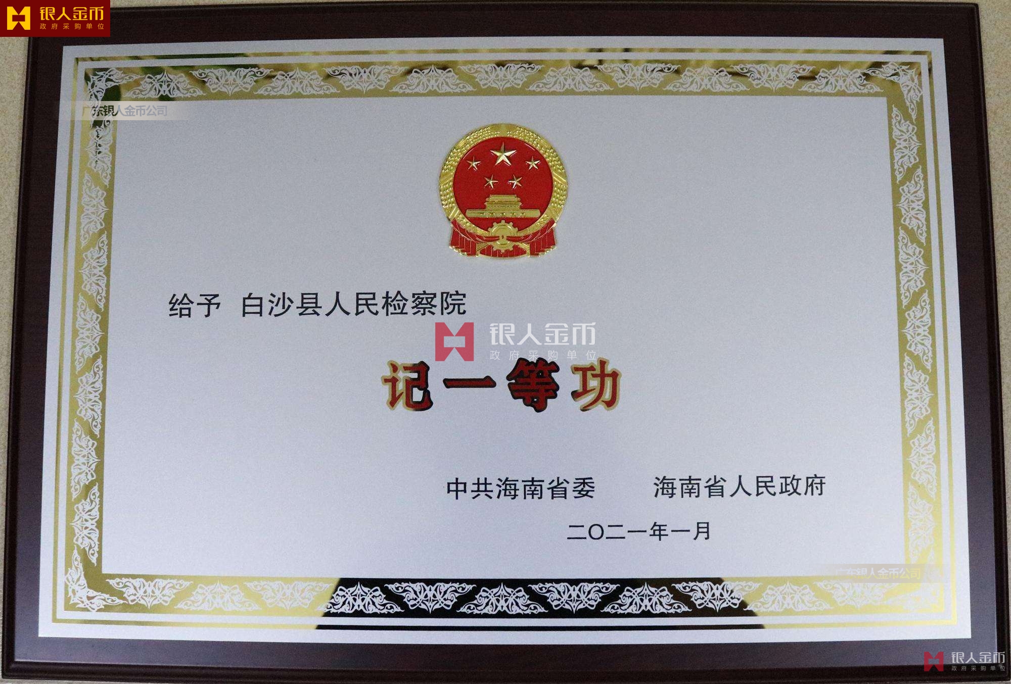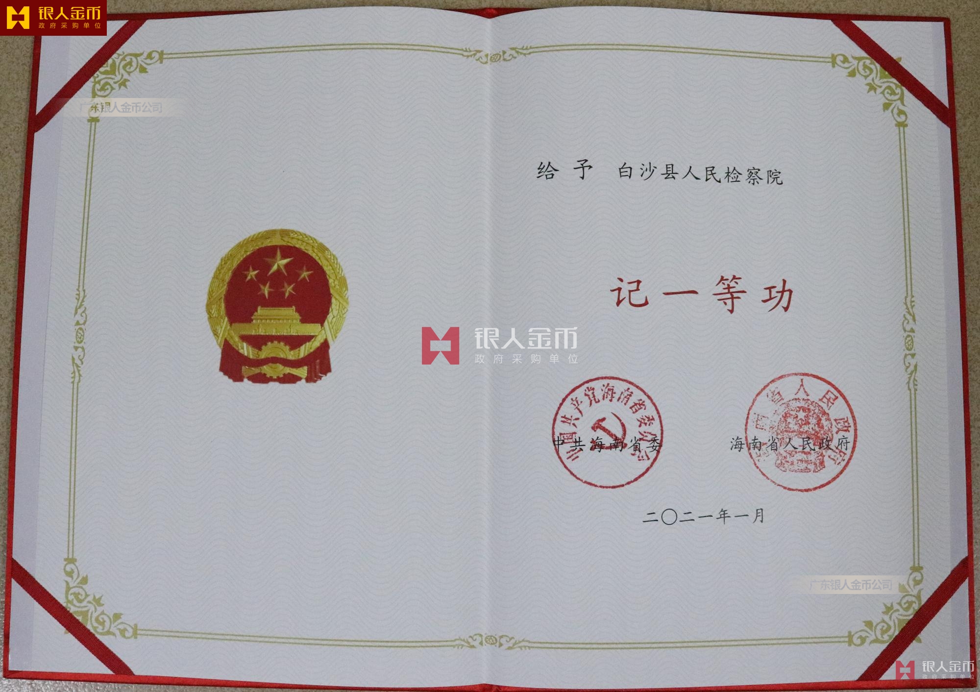 規(guī)格為430×270毫米,正中上方為一枚金屬材質(zhì)國(guó)徽,規(guī)格為75×80毫米;左上部分為獲獎(jiǎng)單位名稱,中間部分為受到何種獎(jiǎng)勵(lì),右下部分為頒獎(jiǎng)單位名稱和頒獎(jiǎng)日期。