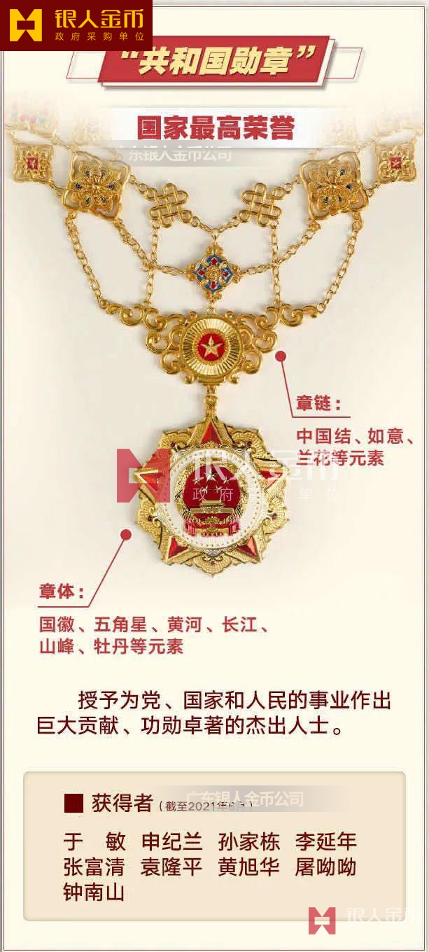 勛章是黨、國(guó)家、軍隊(duì)的至高榮譽(yù),目前主要有“共和國(guó)勛章”、“七一勛章”、“八一勛章”、“友誼勛章”四種。