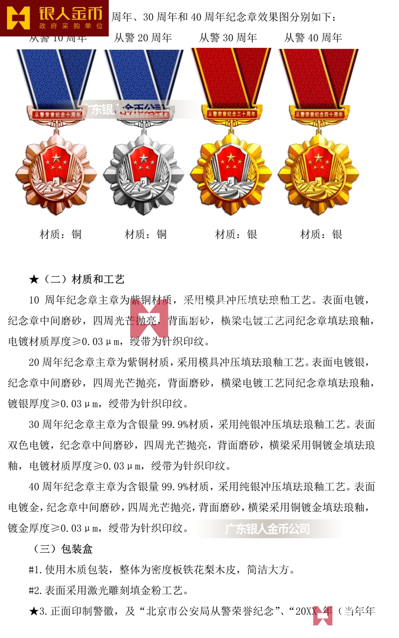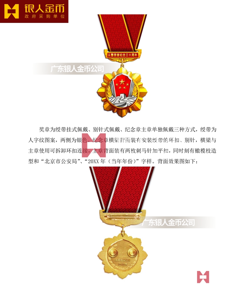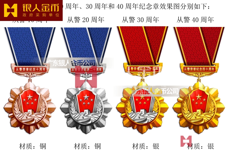 公安民警輔警安保從警10年榮譽(yù)銅質(zhì)紀(jì)念章、從警20年榮譽(yù)銀質(zhì)紀(jì)念章、從警30年金質(zhì)榮譽(yù)紀(jì)念章