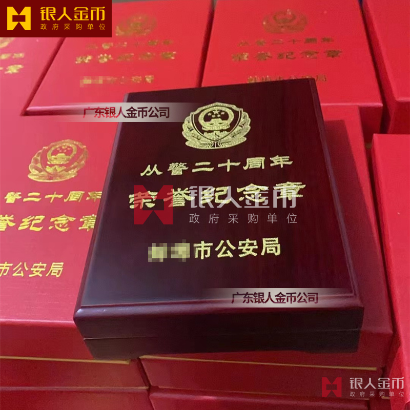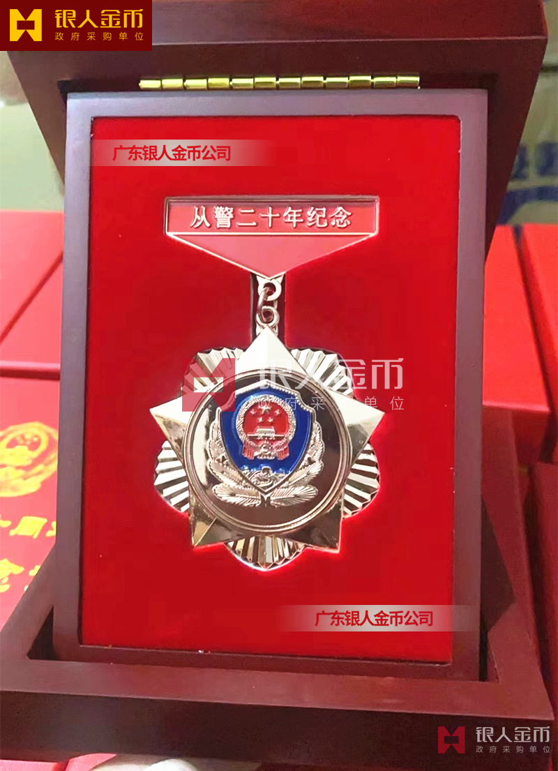 從警紀(jì)念章是為紀(jì)念從事警察工作而頒發(fā)的榮譽(yù)勛章,一般分為從警10周年紀(jì)念章,從警20周年紀(jì)念章,從警30周年紀(jì)念章,從警10周年紀(jì)念章的材質(zhì)一般為銅質(zhì),從警20周年紀(jì)念章一般為銀質(zhì)的,從警30周年紀(jì)念章為純銀表面電鍍24k金的,從警紀(jì)念章一面刻有;“警徽”“人民公安”“XX市公安局”另一面刻有:“Ag999 100g”“公安局機(jī)關(guān)大院大樓”等文字以及圖案。