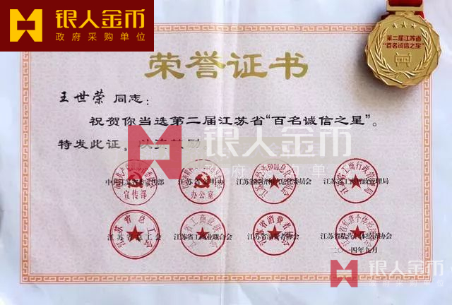 江蘇省百名誠信之星榮譽稱號獎章證書(圖)