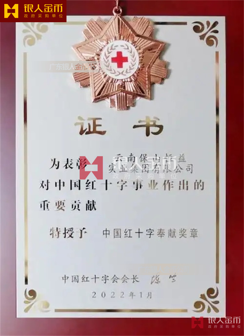 中國紅十字人道勛章中國紅十字會總會為表彰單位、個人對紅十字人道公益事業(yè)作出重大貢獻(xiàn)的捐贈者而設(shè)置的獎項,是中國人道公益事業(yè)的最高榮譽(yù)