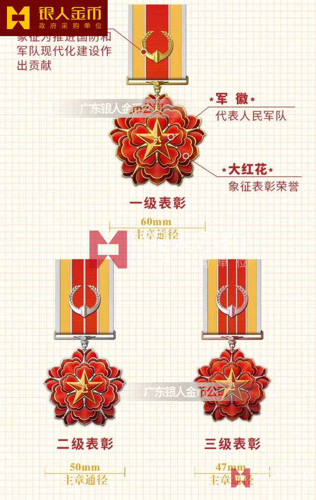 近日,《軍隊(duì)功勛榮譽(yù)表彰條例》印發(fā),同步啟用新時(shí)代軍隊(duì)勛章、獎(jiǎng)?wù)?、紀(jì)念章:①勛章。包括“八一勛章”“紅旗勛章”“紅星勛章”“和平勛章”,主章通徑均為65mm。②獎(jiǎng)?wù)隆0s譽(yù)稱號(hào)獎(jiǎng)?wù)?、?jiǎng)勵(lì)獎(jiǎng)?wù)隆⒈碚锚?jiǎng)?wù)?、和平?jiǎng)?wù)隆"奂o(jì)念章。包括平時(shí)紀(jì)念章、和平紀(jì)念章和其他紀(jì)念章。中央軍委最新版新時(shí)代部隊(duì)?wèi)?zhàn)區(qū)榮譽(yù)稱號(hào)軍隊(duì)勛章、獎(jiǎng)?wù)?、紀(jì)念章(定制標(biāo)準(zhǔn))