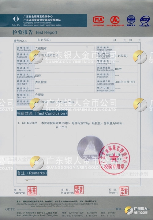國(guó)家金銀質(zhì)量檢測(cè)中心金銀質(zhì)量檢驗(yàn)報(bào)告
