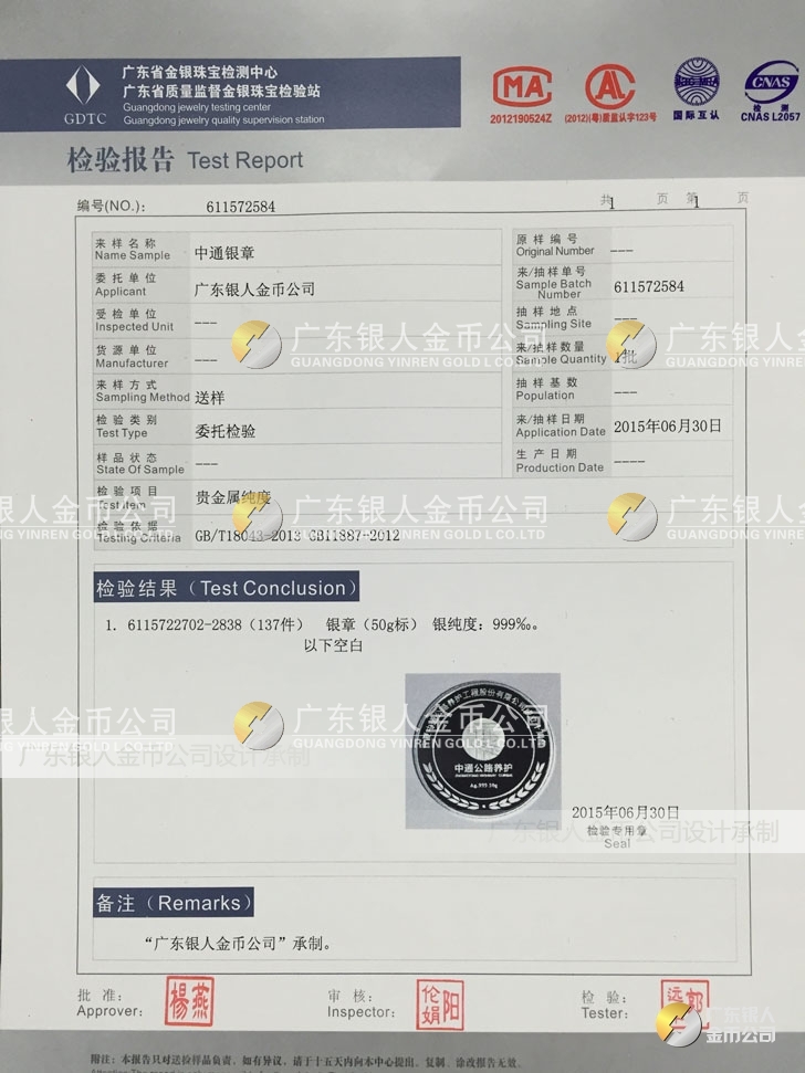 廣東銀人金幣公司承接客戶個性化定制的金銀幣、金銀章、金銀條、金銀牌、金銀盤均由國家質(zhì)監(jiān)部門、嚴格檢測、權(quán)威鑒定:
