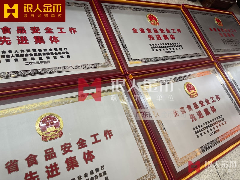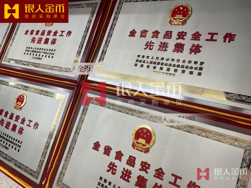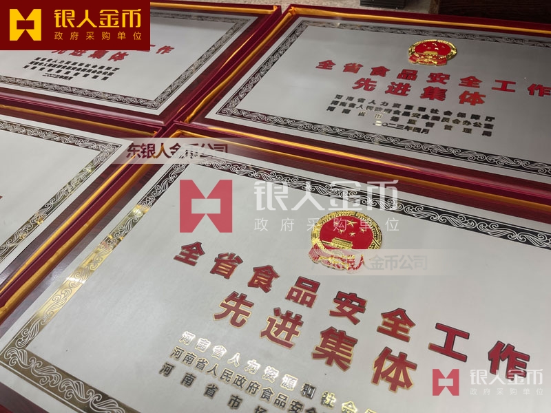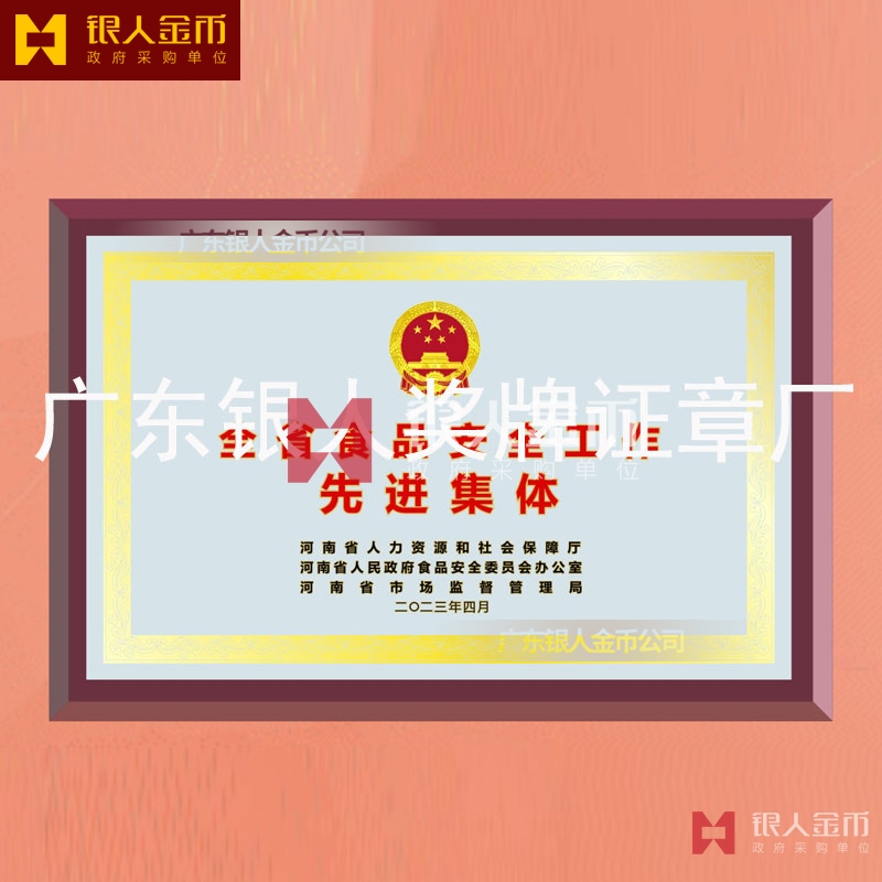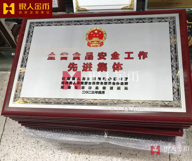 河南省政府食品安全工作先進(jìn)集體獎(jiǎng)牌定制_全省食品安全工作表彰牌匾制作_獎(jiǎng)勵(lì)牌匾訂制_先進(jìn)集體木板底托銅牌制做_貼紅木板鈦金獎(jiǎng)牌定做_貼紅木仿紅木托底鈦金牌匾額匾牌